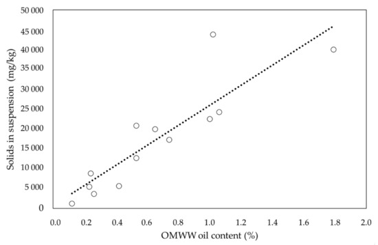 Relation between the solids in suspension of the vegetable meal and oil content in the OMWW.