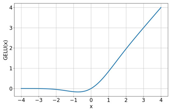 The nonlinear activation function enables the model to learn intricate input features and establish a meaningful transformation between input and output data [36]. GELU non-linearity [37] as expressed in Equation (5) is a smooth and differentiable alternative to the ReLU function, as shown in Equation (4). It offers more smoothness than ReLU as it weights inputs based on percentile instead of sign. Therefore, GELU is popular in vision transformers and NLP AI models.