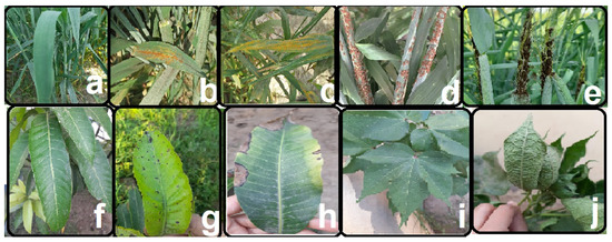Self Collected dataset (a) Wheat healthy (b) Wheat brown rust (c) Wheat yellow rust (d) Wheat stem rust (e) Wheat smut (f) Mango healthy (g) Mango anthracnose (h) Mango nutrient deficient (i) Cotton healthy (j) Cotton Curl.
