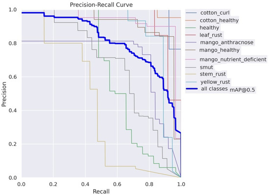 Figure 11 shows the precision-recall curves of all classes at mAP. As the IoU threshold increases the detection accuracy of some classes decreases. The curves of stem rust and healthy(wheat) are more affected due to similarities of their symptoms with other classes. Cotton curl and cotton healthy obtain higher scores in terms of precision and recall as most of their images have high contrast image conditions. The precision and average recall of each class is also shown in Table 4. Almost all the classes are detected with reasonably large values of mAP. Stem rust and wheat healthy classes are either not correctly detected or missed by the model. This is due to the similarity of diseased symptoms with the background.