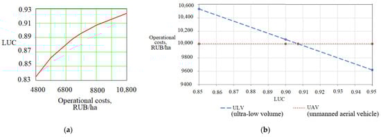 Figure 5b, it is assumed that the treatment cost for small aircraft use is 350 RUB/ha with a PPA application rate of 50–100 L/ha. For UAV use, the treatment cost is assumed to be 1100 RUB/ha with a PPA application rate of 5–10 L/ha. The cost of 1 L of herbicide is RUB 11,014. It is assumed that in both cases, the equipment is rented from a specialized company. The investment for the purchase of the equipment is included in the cost of crop treatment.