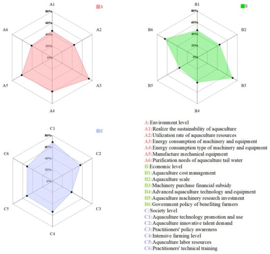 The influencing factors of aquaculture mechanization were hierarchical and dynamic. They were affected and restricted by many factors, and finally, 18 effective factors were obtained. The environmental level was set as A: A1 realizes the sustainability of aquaculture (46.13%); A2 is the utilization rate of the aquaculture resources (43.77%); A3 is the energy consumption of the machinery and equipment (73.13%); A4 is the energy consumption type of the machinery and equipment (58.72%); A5 is the manufacture of the mechanical equipment (60.81%); and A6 is the purification needs of the aquaculture tail water (41.15%). On the economic level, it was set as B: B1 is the aquaculture cost management (47.28%); B2 is the aquaculture scale (small but scattered) (44.69%); B3 is the machinery purchase financial subsidy (70.64%); B4 is the advanced aquaculture technology and equipment (43.38%); B5 is the aquaculture machinery research investment (35.65%); and B6 is the government’s policy to benefit farmers (64.61%). At the social level, it was set as C: C1 is the aquaculture technology promotion and use (68.15%); C2 is the aquaculture innovative talent demand (55.96%); C3 is the practitioners’ policy awareness (38.27%); C4 is the intensive farming level (53.47%); C5 is the aquaculture labor resources (51.64%); and C6 is the practitioners’ technical training (51.25%). The image sets are shown in Figure 2.