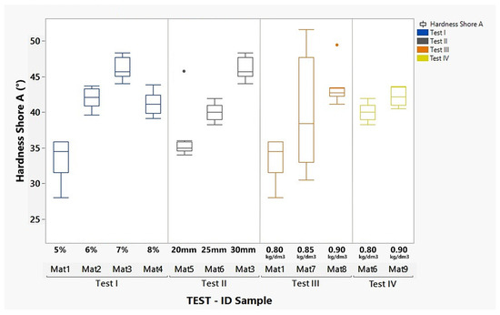A preliminary observation concerns the homogeneity of the mat structure across all points of the previously established measurement grid. The graph in Figure 4 shows the unaggregated hardness measurements for each grid point of each sample. As can be seen, the consistency of the mat across the nine measurement points is quite homogeneous, with the exception of sample Mat7, which gave the most scattered values. This result is probably not due to the combination set for this mat during preparation (final density 0.85 kg/dm3, binder content 5%, thickness 30 mm), but rather to the method by which the mat is prepared. While the press mechanically selects and prepares the rubber-binder mixture to be pressed according to the instructions given by the operator on the machine’s control panel, the spreading and distribution of the mixture on the mould is carried out by specialised technical personnel who spread the mixture manually using appropriate tools. As can be seen from the graph, this manual process can potentially lead to situations of uneven mat texture and represents an area for improvement, where the introduction of an electronically controlled mechanical device could optimise the uniform distribution of material on the mould. Despite this critical aspect, it should be noted that the hardness differences observed for sample Mat7 are not significant enough to alter its consistency, which remains close to the intermediate range of the transition from soft to hard.