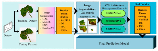 Figure 3 shows image segmentation for the training dataset using three distinct methods. After this, the segmented results are subjected to one of four decision fusion strategies: unweighted average (UWA), differential evolution algorithm (DE), particle swarm optimization (PSO), and Variable Neighborhood Strategy Adaptive Search (VaNSAS). Subsequently, the segmented images are processed through image augmentation before being fed into a heterogeneous ensemble of MobileNetV3, SqueezeNetV2, and ShuffleNetV2 CNN models. Similar to the segmentation step, the CNNs are fused using the same decision fusion strategies. Finally, the classification is predicted. On the other hand, the testing dataset follows the same procedure but omits image augmentation.