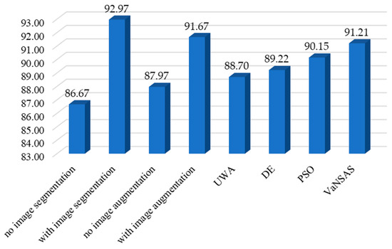 Based on the computational results presented in Table 3 and Figure 4, it is evident that image segmentation plays a crucial role in improving the accuracy of the classification model, with an increase of 7.26% compared to the model that does not use it. The use of image augmentation also leads to significant improvement, with a 4.21% increase in accuracy compared to the model that does not use it. Moreover, using VaNSAS as the decision fusion strategy further enhances the solution quality by 2.83%, 2.23%, and 1.18% compared to using UWA, DE, and PSO, respectively. Therefore, it can be concluded that incorporating image segmentation, image augmentation, and VaNSAS as a decision fusion strategy are effective techniques for improving the accuracy of the CAU leaf abnormality classification deep learning model.