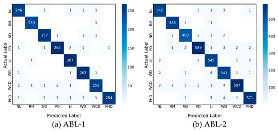 Table 2 shows dataset ABL-1, comprising 14,860 images classified into classes NL, RM, ND, PD, LI, WD, WCD, and PHD, with corresponding image counts of 1250, 1200, 1300, 1350, 1340, 1330, 1280, and 1300, respectively. Furthermore, dataset ABL-2 displays varying image counts in each class, ranging from 500 to 600 images. The datasets are available at https://doi.org/10.34740/KAGGLE/DS/3619913 (accessed on 6 October 2023).