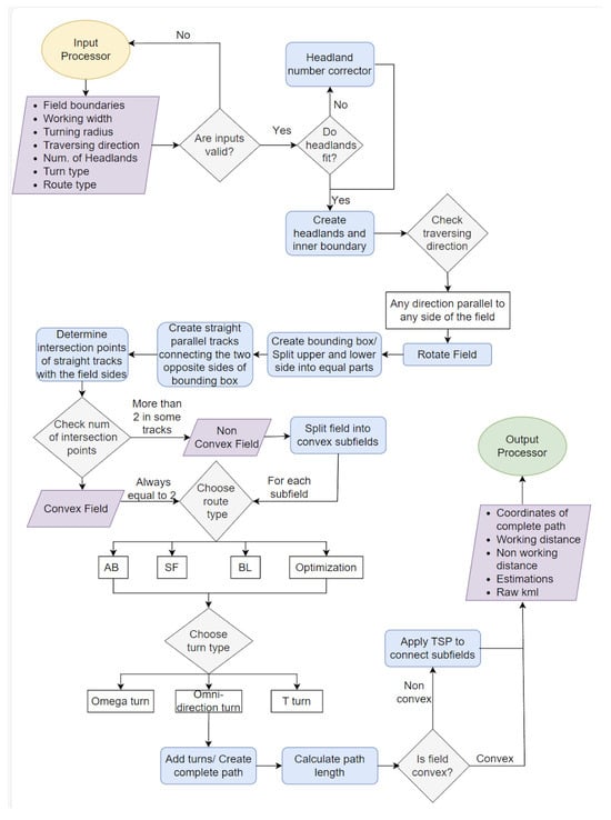 - Bochtis, D.D.; Vougioukas, S.G. Minimising the non-working distance travelled by machines operating in a headland field pattern. Biosyst. Eng. 2008, 101, 1–12. [Google Scholar] [CrossRef]