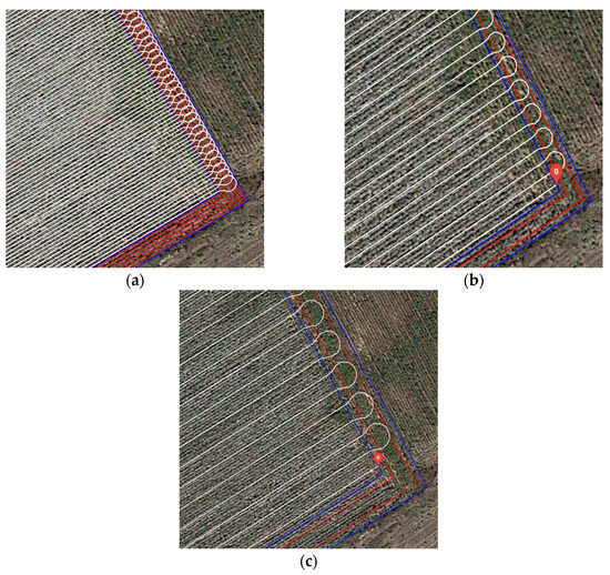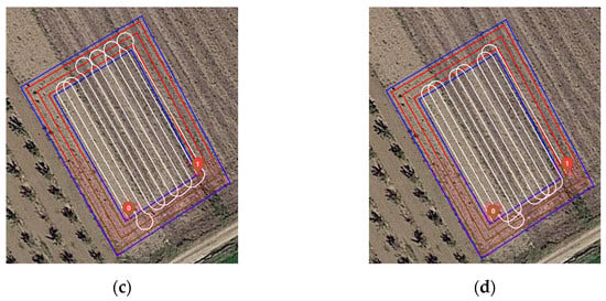 The number of headland passes is defined by the user. However, there are cases where that number could be reduced or increased by the system. When there is a narrow area in the field or field boundary corners are sharp, headland passes may intersect or overlap [42]. In this case, the number of headland passes set by the user is automatically and gradually reduced by one. Figure 3a illustrates an example where six passes were selected as an input, but they were decreased to four to provide a feasible plan. On the other hand, in cases where the UGV presents a low degree of maneuverability (or agronomic factors impose smooth turnings), the number of headland passes can be increased to ensure that the UGV remains within the boundaries of the field during turns. Figure 3b shows an example where two headland passes were selected by the user; however, four headland passes were created to prevent the UGV from moving outside the field.