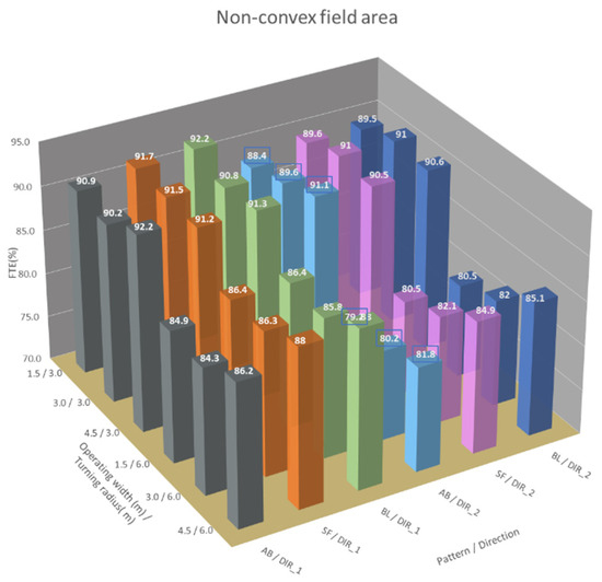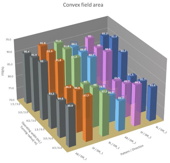 The evaluation of the 36 different use-cases involved the utilization of the FTE index. A visualization of the results of all use-cases in terms of FTE performance is provided in Figure 9 and Figure 10. The first chart (Figure 9) illustrates the results for Field A. The highest value of FTE (0.93) was observed when the UGV performs the AB route type operating parallel to the longest edge of the field (DIR_1), with an operating width of 4.5 m and a minimum turning radius of 3 m. Conversely, the lowest value of FTE (0.797) was observed in the use-case of the AB route type, where UGV was operating parallel to direction DIR_2, with an operating width of 1.5 m and minimum turning radius of 6 m. The average FTE index value for all the use cases for field A was 0.873.