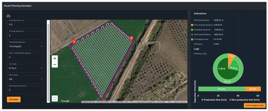 The representation of results in the user interface provides the opportunity for the user to better control their farm–field operations and to make alterations to ensure optimal route-planning. The successful autonomous navigation of an agricultural robot in real-word conditions based on plans created by the route-planning module indicates the effectiveness and applicability of the proposed system. The system can handle cases involving convex and non-convex field shapes and can be adapted to different turn types, fieldwork patterns, including optimized ones, working widths, and vehicle kinematics. The system is applicable in various row-based crops when aiming to cover parallel fieldwork tracks. This includes, in principle, all arable farming operations, including full field-area crop coverage (e.g., wheat) and row crops (e.g., cotton), where the vehicle wheels should only be placed in uncultivated strips, as well as orchard operations where inter-row strips are parallel and a headland area is available for the vehicle turnings. The flexibility provided to the user in selecting different operational features can lead to the creation of the most efficient path based on field geometry and the UGV’s kinematics. The case studies showed variability in the operational performance to allow for the field traversal efficiency to be between 79.2% and 93%, while, when implementing the optimal route-planning functionality of the system, there was an improvement of up to 9.5% in the field efficiency. By considering operational factors, the non-working distance can be effectively minimized, and the operation execution time can be reduced, leading to a decrease in operational costs. The user interface provides an interactive tool for the before-operation simulation and testing to allow for the selection of the most efficient field coverage configuration. For example, Figure 15 shows the results of a use-case in the first experiment as presented to the user interface. On the left side, all users’ input parameters are displayed. In the center of the interface, a dynamic map visualization is illustrated, which depicts the route that was created over the field to allow for a better spatial understanding. On the right side, an estimation of total working distance, non-working distance, headland distance, field body distance, overlapped area, and field efficiency are displayed. The “send navigation plan” button allows for the direct transfer of the generated navigation plan to the “connected” UGV.