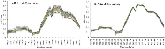 Hyperspectral images are affected by light scattering that occurs on the sample, which produces baseline drift in the reflectance spectra, so the pre-calibrated reflectance spectra should be pre-processed afterward [19]. Multiplicative scatter correction (MSC) is a multivariate scatter-correction technique that eliminates baseline drift by using ideal spectra to increase the signal-to-noise ratio of the original spectral absorbance so that they contain more spectral information related to the component or content to be measured. MSC processing was finished with Matlab R2021b.