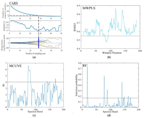 Feature bands were extracted mainly to solve the problem of the large amount and high redundancy of hyperspectral data. In this study, we used competitive adaptive reweighted sampling (CARS), moving window PLS (MWPLS), Monte Carlo uninformative variables elimination (MCUVE), and random frog (RF) to extract feature bands from the MSC-processed spectral data through Matlab R2021b.
