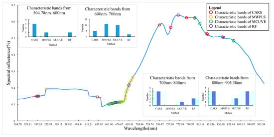 The graph of the results of the CARS method (Figure 4) shows that the number of remaining bands decreases monotonically from 195 as the number of iterations increases. The root mean square error of cross-validation (RMSECV) reaches a minimum at the 28th iteration (at the vertical line consisting of blue stars). At this point, 16 bands remain, and the CARS method extracts these 16 bands as its feature bands. The feature bands in the remaining three methods are then extracted to obtain, to the extent possible, the same number of feature bands as obtained by the CARS method. The graph of the result for the MWPLS method (Figure 4) shows the curve that gives the root mean square error fit (RMSEF) as a function of window position for window width 15, which is set according to the total number of spectral bands. With the principle of trying to select a similar number of characteristic bands, the 12 bands corresponding to RMSEF < 0.55 are extracted as the feature bands. In the graph of the results from the MCUVE method, using the same principle as MWPLS method, 13 bands corresponding to Reliability > 4 are extracted as the feature bands. For the RF method, the bands with a selection probability greater than 1.7 are extracted, for a total of 9 feature bands extracted according to the same principle mentioned before. Table 1 lists the specific feature bands extracted.