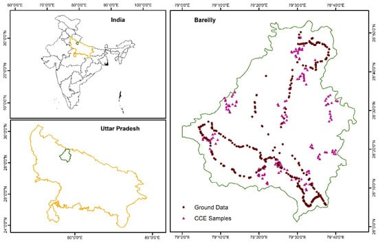 Bareilly district in Uttar Pradesh, situated on the Ganges River plain between 28°8′ and 28°58′ north latitude and 78°58′ and 79°47′ east longitude, experiences a monsoon-influenced climate with an average annual precipitation of 800–900 mm []. The district’s temperature variations, ranging from hot summers exceeding 40 °C to cool winters between 4 and 20 °C, contribute to the cultivation of a diverse range of crops. The region’s fertile alluvial soils support its thriving agricultural sector, with wheat, rice, sugarcane, pulses, oilseeds and vegetables being the primary crops. With the adoption of modern agricultural practices and irrigation facilities, including canals and tube wells, Bareilly district plays a crucial role in Uttar Pradesh’s agricultural landscape and agricultural production.