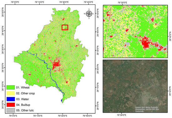 Accurate information regarding the productivity of staple crops at their scale is highly essential for successful national planning as well as for ensuring food security at the country level. The application of satellite-based remote sensing emerges as a practical and cost-effective strategy for thorough crop monitoring, both at regional and national levels []. The agricultural sector plays an important role in India’s economy, contributing almost 19.9% to the nation’s GDP and employing almost half of the country’s workforce []. Wheat is one of the major staple crops grown during the post-rainy season in India, especially in Eastern India. It is cultivated with broad adaptability from temperate to cold environments in Northern India. The major wheat-producing states in India are Uttar Pradesh, Madhya Pradesh, Punjab, Haryana and Bihar [].