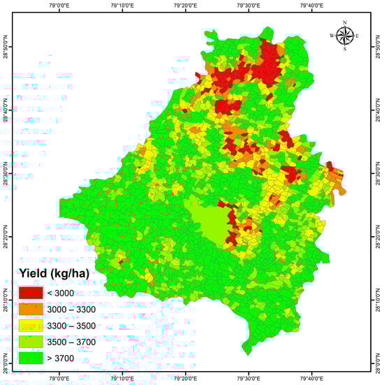 Using ML algorithms, the CCE points were utilized as training data against NDVI images to differentiate and predict crop yields across the entire district (Figure 6). The analysis uncovered a notably positive correlation between the NDVI and crop yield, indicating the potential of the NDVI as a reliable indicator for agricultural productivity. Subsequently, pixel-level yields were aggregated to GP levels, offering a more comprehensive understanding of crop performance across different regions/ecosystems.