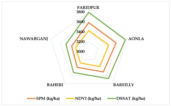 The highest average yield is noticed in Faridpur, followed by Aonla, Bareilly and Baheri, and the lowest in Nawabganj. The gap between the yields calculated through these three models is well observed in the above chart.