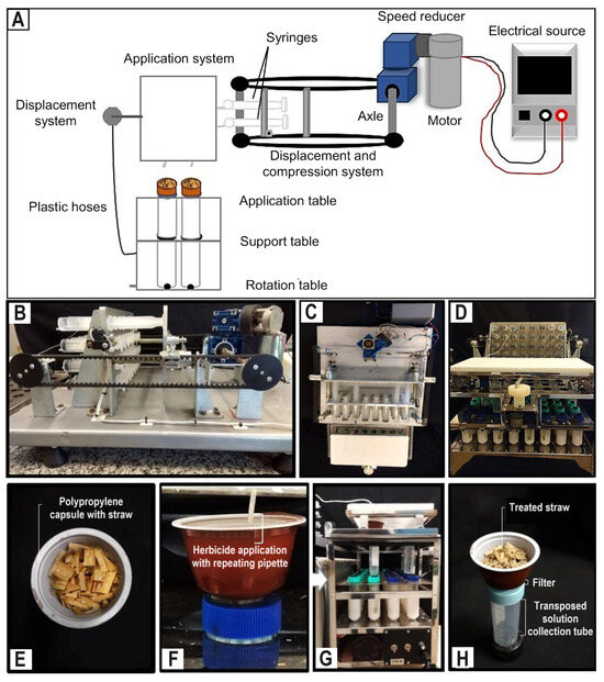 (A) Scheme of the system developed for herbicide application and rain simulation. Sequence of the equipment structures: (B) side view of the syringe compression system; (C) top view of the rain application and simulation table; and (D) front view of the rain application and simulation table. Sequence of herbicide application or rain simulation: (E) polypropylene capsule with straw treated with repeat pipette; (F) Falcon collection tube with capsule when applying herbicides or simulating rain; (G) herbicide solution in movement to be collected (white arrow); and (H) collection of the herbicide solution for chromatographic analysis.