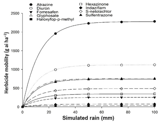 The behavior of the herbicide movement concerning rainfall volumes was determined by fitting the data to Mitscherlich’s non-linear regression model: y = a(1 − 10−c(0+x)) [32], where a is the asymptote of the model, corresponding to the maximum amount of herbicide moved through the straw, c is the concavity of the curve, determining the exit speed of the herbicide from the straw, x is the volume of rain necessary to move the herbicide (mm), and y is the total amount of herbicide transferred from the 10 t·ha−1 layer of straw. This model is employed to express the relationship between a stimulus or time variable and a response, with applications particularly in the field of measurement reliability [33].