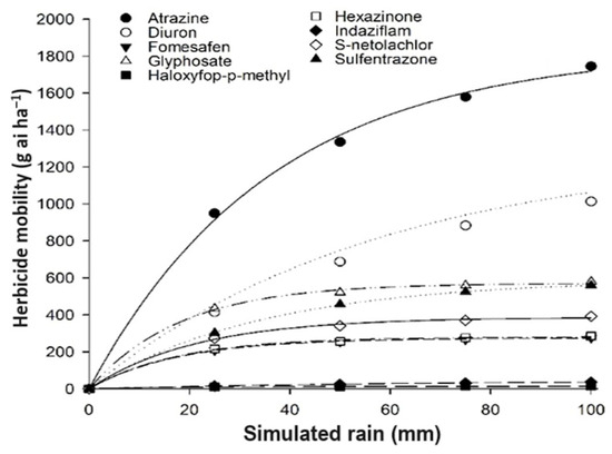 Overall, herbicide movement was higher in wet straw than in dry straw. Some herbicides, such as haloxyfop-P-methyl and indaziflam, exhibited an increase of over 50% in wet straw compared to dry straw after accumulating 100 mm of simulated rain. Most other herbicides showed increases ranging from 17% to 25%. Diuron and fomesafen demonstrated increases of less than 10% in wet straw compared to dry straw (Table 4). This observed behavior may be linked to the formulation used and the solubility of the molecules in water, which can vary between high and low levels. The Koc values, ranging from moderately mobile to mobile (Table S1), influence herbicide movement under the evaluated conditions. Various factors, such as application period, application rate, type of coverage, intensity of irrigation or precipitation, infiltration rate, and physical-chemical properties of the product and soil, contribute to the concentration and distance of herbicide transport [1,3,4,20].