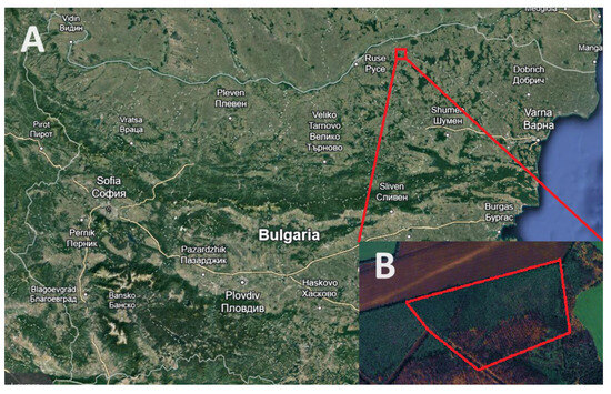 Figure 1) in the 2023 growing season. The coordinates of the village are 43°54′28.59″ N, 26°23′49.02″ E, and it stands at an elevation of 107 m above sea level. The predominant forest vegetation is composed of broad-leaved mixed forests. Important for beekeeping are the shrubs dogwood and hawthorn and the tree species of black locust and linden. The climate is continental with characteristic cold winters and hot summers. The soils in the area are leached chernozem. The most important honey plant in the area is the black locust. A large part of black locust trees are found as single trees in mixed forest massifs of oak and linden, which makes it difficult to determine the areas they occupy when calculating the honey balance in the beekeeping region. Based on phenological observations made in the period from 2021 to 2023, we found that the beginning of flowering in 2021 started on 15 May 2021 and lasted until 22 May 2021. In 2022, flowering started on 15 May 2022 and ended on 25 May 2022. In 2023, flowering started on the 18 May 2023 and ended on the 30 May 2023. Multiple aerial monitoring procedures were carried out, and for the purpose of our experiment, photographs were collected during the period of full bloom of the black locust coinciding with the date 21 May 2023.