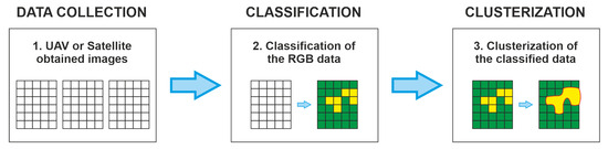 Figure 3. It can use visual spectrum (RGB) data from a UAV or a satellite source. Next, the images are processed and their pixels are classified into two categories: