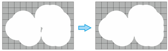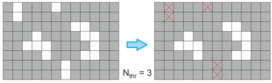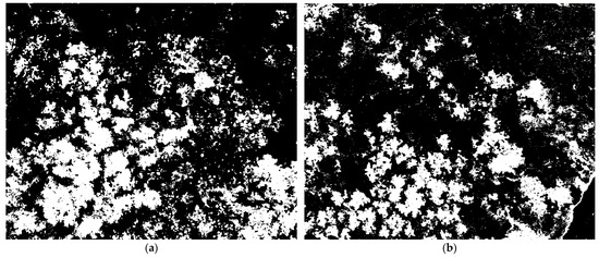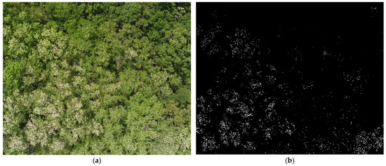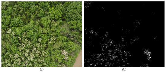 Figure 8b, respectively. It can be seen that the identified white bloom pixels are quite scattered and therefore cannot be directly used for analyzing the images. Therefore, the next steps from the image processing have been applied.