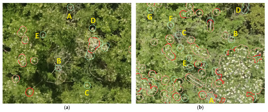 Figure 11b (E, F, G). In most cases, their identification is unwanted because these trees are either not yet entirely blooming or their blooming is already passing. Other clusters wrongly identify logs and branches of withered trees, because of their bright color, i.e., they can be categorized as false-positives. Such examples can be noticed in