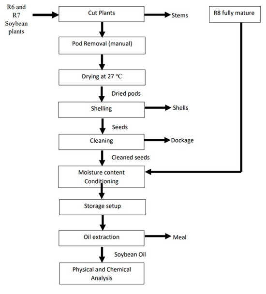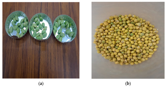 The soybeans were harvested at three different maturity stages: R6 (green pods with full green seeds), R7 (beginning of maturity: semi-green or yellow pods), and R8 (fully matured; 95% of mature pods). The R8 was the control. Harvesting was conducted on 31 August, 5 September, and 27 September 2018 for the R6, R7, and R8 seeds, respectively.