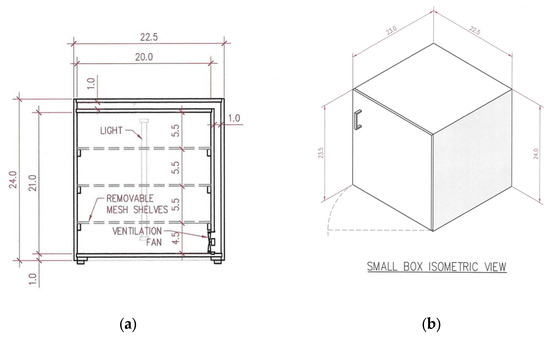 Fabricated small storage box/chamber. (a) Front view of the inside of the box. (b) Exterior view of the assembled box with outer dimensions. All dimensions in cm.
