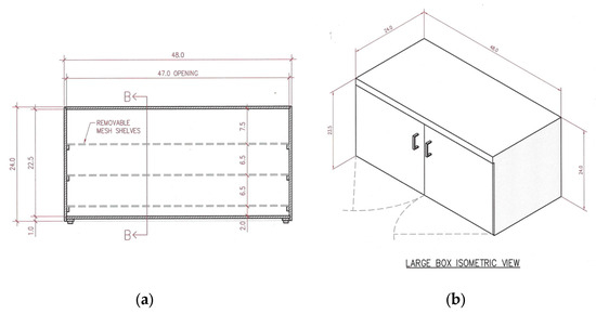 Fabricated large storage box/chamber. (a) Front of the inside view of the box. (b) Complete view of the assembled box with outer dimensions (cm). “B” indicates the front view.