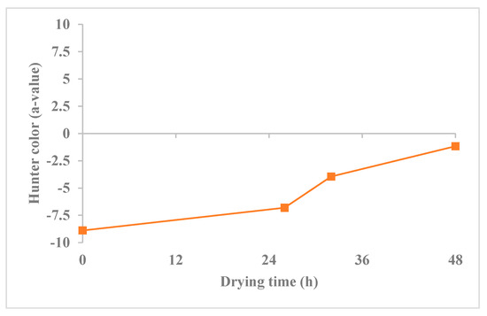 An increase in the color a-value of more than 70% was recorded at the end of the drying period from −8.89 to −1.71 for the R6 soybeans. Consequently, the soybean seeds were characterized with a bright yellowish-green color after being subjected to the drying process, indicating the fading away of the green tone as shown in Figure 5. Ref. [13] reported similar yellowing and an increase in color a-value when Brazilian soybean seeds at R6 underwent drying at 25 °C for 10 days. The change in color can likely be attributed to the degradation in the chlorophyll content of the green seeds during the low-temperature drying process [13,17,33].