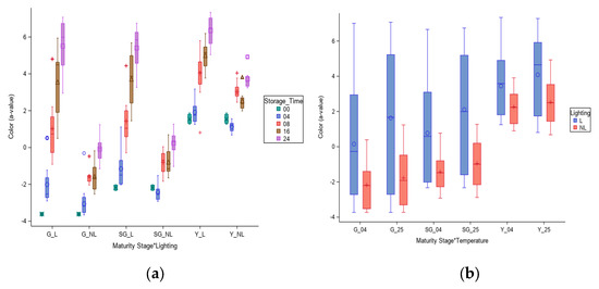 A closer look at these storage environment factors revealed that lighting conditions (factor) contributed the most to the SOV of the analyzed data. Of the remaining total 18% SOV of all storage environment factors, light alone contributed 14.6% (~81%) with less than 4% for the other factors (temperature contributing 1.6% and moisture content and aeration less than 1.8%). The differences in moisture content and aeration had a very small effect on the color change observed. In addition, the two-way and three-way interactions that were not significant in the ANOVA had either aeration or moisture content. Interactions that contributed the most SOV in the two-way and three-way interactions had either temperature, lighting, maturity stage, and storage time conditions present. Most of the two-way interactions that contributed to at least 5% SOV observed in color either had temperature, lighting, maturity stage, and storage time. In the three-way interactions, the only factors that contributed to this amount of SOV was the maturity stage, lighting, and storage time. Based on this finding, visualization plots were used to look in-depth at the effect of these interactions on the Hunter color a-value. A summary of the information table is provided in Table 3.