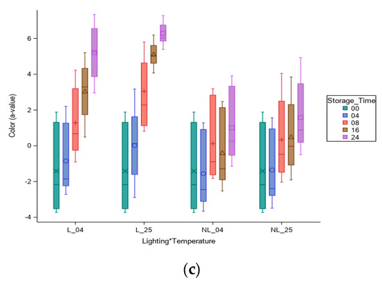 The last three-way interaction combination for lighting and temperature plot (Figure 6c) further emphasized the impact of light on the increase in color “a” value irrespective of the temperature condition in storage. The highest color a-value is recorded for samples under light conditions, again irrespective of the temperature of storage, with lower values observed for samples stored under no light conditions. These findings seemed to reveal the impact of light conditions on the increase in color a-value, which resulted in the fading away of the R6 green and R7 semi-green color of soybeans in storage. According to a University of Missouri study, sunlight and natural metabolic process were responsible for the decomposition of chlorophyll during soybean seed maturation [34]. Artificial lighting such as full spectrum fluorescent tubes has been shown to mimic and effectively simulate sunlight (natural light) because it characterizes the total visible spectrum [35]. A study reported the use of LED light to improve the quality of tomatoes [36]. Hence, in our study, the color change observed in the samples stored under florescence light can be attributed to similar results observed under field drying conditions because of sunlight.