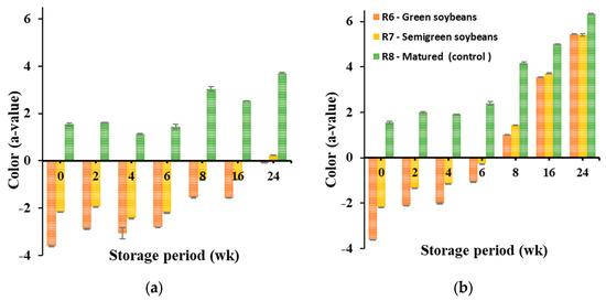 Color change (a-value) of soybeans under storage conditions of (a) without light and (b) with light.