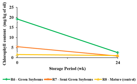 At the end of the storage period, oil extracted from R6 and R7, under this same condition, showed the most evident fading away of green color in stored soybeans as explained under the color change in the stored seeds section above. It is remarkably interesting to see the fading away of the green coloration in the R6 and R7 maturity soybeans for samples stored under light at the end of the experiment. These findings support the fading away of the green tone of R6 and R7 soybeans observed after 24 weeks of storage for soybeans stored under light. This also shows a relationship between the color change, chlorophyll content, and oil color of stored seeds.