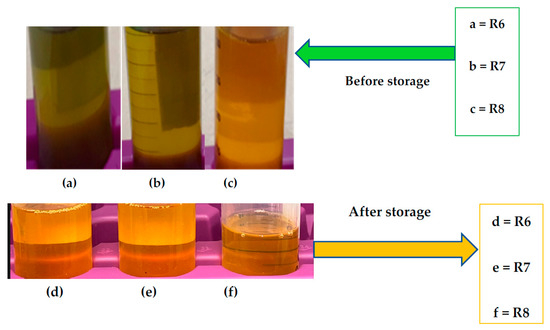 Color of extracted oil from R6 (green), R7 (semi-green), and R8 (matured) soybeans stored under light conditions. (a) R6 at week 0, (b) R7 at week 0, (c) R8 at week 0, (d) R6 at week 24, (e) R7 at week 24, and (f) R8 at week 24.