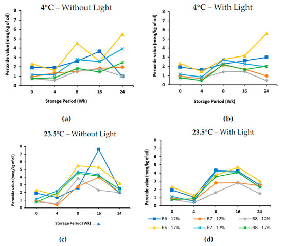 Peroxide value (meq/kg) for stored soybeans under lighting conditions at storage temperatures of 4 °C and 23.5 °C (a) without light and (b) with light at 4 °C (c) and without light and (d) with light at 23.5 °C.