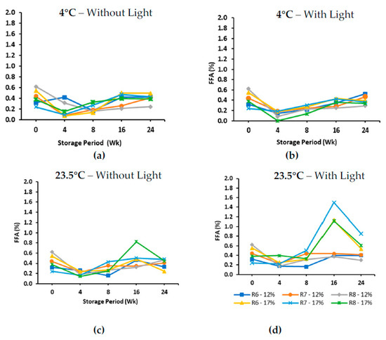 In general, very low levels of FFA were recorded for soybeans throughout the storage period at 4 °C. The values were within the acceptable limit irrespective of the maturity stage and moisture content of the soybeans. In addition, an effect of lighting conditions (with or without light) was not observed on the FFA content. Many studies have reported that FFA development is retarded at storage temperatures that are below 10 °C and with soybeans below 17% moisture content in stored grains over a six-month period [41,42,43]. However, there was a slight increase observed in FFA content for samples stored at a warm temperature of 23.5 °C. For samples under light conditions and at 17% moisture, it was observed that FFA content increased to 1.13%, 1.50%, and 1.12% after 16 weeks of storage for R6, R7, and R8 (control) soybeans. These values all exceeded the acceptable limit and the increase in FFA values can be likely due to the high moisture content of the seeds and temperature of storage.