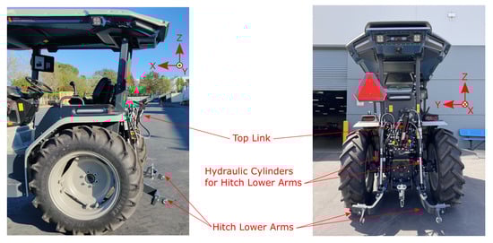 The three-point hitch system of the Monarch Tractor’s MK-V platform is shown in Figure 1. It consists of one hydraulic top link cylinder and two independently controlled hydraulic cylinders for lower arms. The top link plays an important role in adapting to the attached implement’s geometry and keeping the pitch of the implement at a particular angle. Unlike traditional solid top links, which are spun by hand to adjust their length, the MK-V top link is hydraulically actuated by joystick commands. In this study, the length of the top link was predetermined, and the cylinder motion was hydraulically locked.
