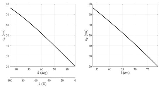 Plots demonstrating the variation in the lift point height with respect to angle and cylinder length . Left plot: Variation in the lift point height () with respect to in degrees (upper X-axis) and in percentage (lower X-axis). Right plot: Variation in the lift point height () as the hydraulic cylinder is extended, i.e., l is increased from its minimum to maximum value.