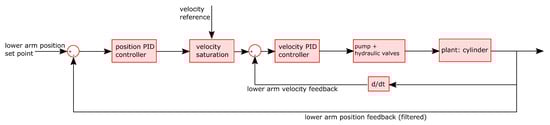 The controller is designed to control the position and velocities of the lower arms. Two of these controllers operate in parallel on the two hydraulic lower arm cylinders. The outer loop controller runs on the position error, whereas the inner loop controller runs on the velocity error.