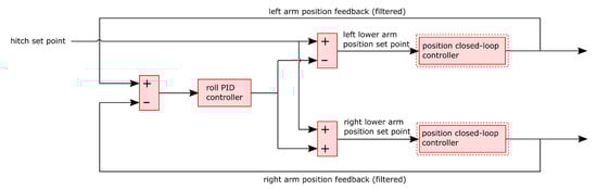 The hitch position control system requires both arms to follow a position trajectory in a synchronized manner. However, due to variations in the load on these arms as well as the limitations of the individual closed-loop position controllers, the two arms can often become out of sync. As a reason, it is important to include a roll controller that converges the roll to zero. We define roll, in this case, as the difference between the left arm position and the right arm position. This combined controller, which controls the three-point hitch system, is shown in the form of a block diagram in Figure 6, and it includes the position controller from Figure 5 (shown with dashed boxes in Figure 6).