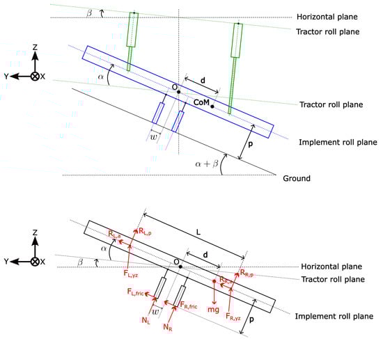 Top: Geometry of a connected implement (blue) with off-center center of mass while the tractor (green) moves on uneven terrain (black). The tractor has a roll angle of with respect to the horizontal, and the implement has a roll angle of with respect to the tractor’s plane. The implement has an offset center of mass, which is distance d away from the center, and it has two wheels attached at a distance of w from the center. The height of the wheels’ contact from the ground to the implement’s plane is p. Bottom: free body diagram of the implement of mass m. The distance between the implement’s mount points is L, which varies with . The left and right three-point arms apply hydraulic forces whose components YZ plane are and , respectively, and they are perpendicular to the tractor’s roll plane. The reaction forces at the mount points are resolved into components along (, ) and perpendicular (, ) to the implement’s plane. The implement experiences normal reactions , and frictional forces , from the contact of its left and right wheels, respectively, with the ground.