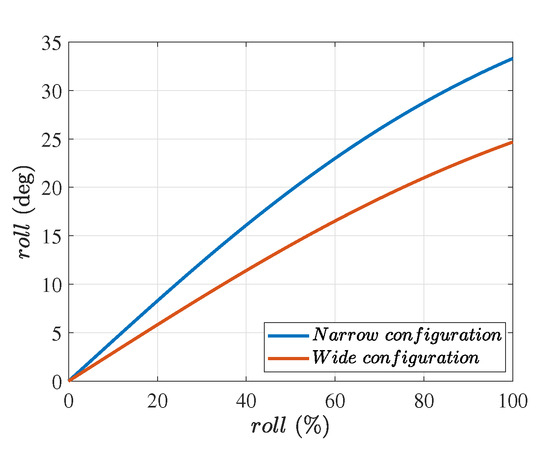 We conducted two distinct sets of experiments to validate the two software algorithms described in Section 3: the first set of experiments was to validate the position control algorithm from Section 3.2 and the second set of experiments was to validate the roll control in float mode using the software rock shaft algorithm described in Section 3.3. For all the conducted experiments, we recorded the angles of both the lower arms at the pivot point O from Figure 2 using angle sensors and then post-processed these measurements to calculate velocity and roll. First, the extreme angles for the arms’ motion were mapped to 0–100%, 0% corresponding to the angle for the lowest position, and 100% corresponding to the angle for the highest position of the arms. The position (in percentage) of the hitch is defined as the average position (in percentage) of each of the two lower arms. Secondly, since we do not have a sensor that measures the angular velocity directly, we rely on differentiating the position measurements to find the velocity of the hitch arms in percent per second. We perform calculations in three stages to obtain the velocity. In the first stage, we apply a moving average filter with a time window of 300 ms on the position readings with a sample time of 5 ms (200 Hz). This means that we have a total of 60 points in the moving average window. In the second stage, these filtered readings are differentiated using a two-point finite difference numerical derivative to obtain velocity measurements. These are further fed into a low-pass filter with a cutoff frequency of 3.35 Hz. The above-mentioned values of the time window and cutoff frequency were chosen to reduce noise. The implement’s roll is defined as the difference between the left arm position and the right arm position. Figure 8 provides a physical interpretation of the roll of an implement attached to the hitch arms, which was obtained from the geometrical relationship between from Equation (1) and range of values of from Table 1. While the arms are in a narrow configuration, i.e., the hitch arms are 86 cm apart, the implement can roll up to an angle of °. Whereas in the wide configuration, where the hitch arms are 123 cm apart, the implement can roll up to an angle of °.
