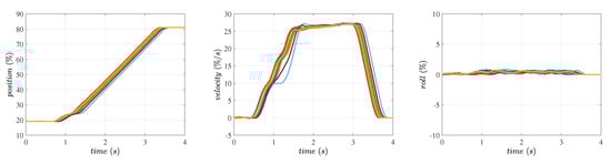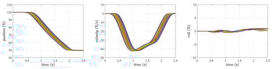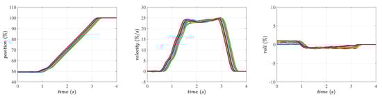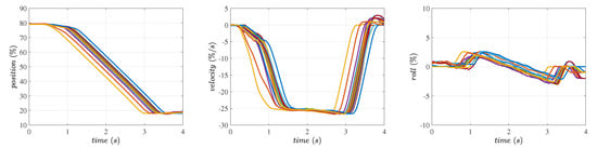 Results from 17 trials conducted on a tractor while moving the hitch down in position control without an implement attached. Left plot: Position of the hitch. The hitch was initially at 80% and a set point of 20% was commanded. Center plot: Velocity of the hitch. A velocity set point of −25%/s was commanded. Right plot: Roll of the hitch system. The roll controller aims to maintain zero roll of the hitch.