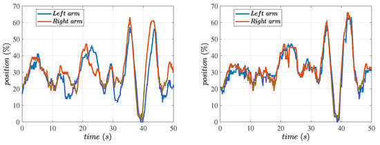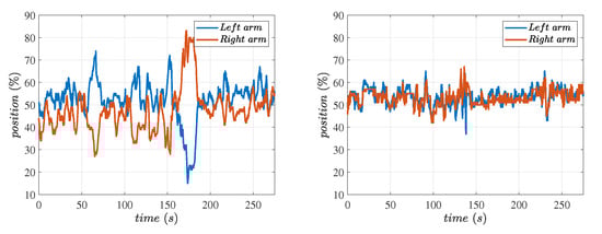 Positions of the left and right arms in % with software rock shaft off (left) and with software rock shaft turned on (right) while using a Tierre Lupo flail mower.