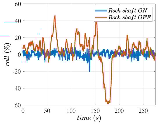 Comparison of the roll (difference between the left and right hitch arms in %) while using a Tierre Lupo flail mower. It was observed that there was noticeable roll when the software rock shaft was turned off.