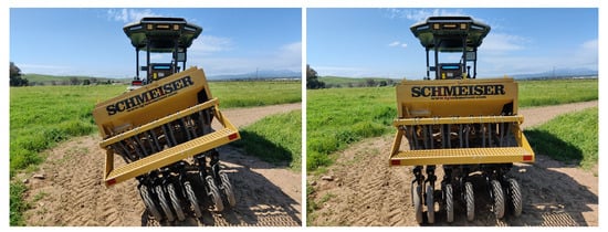 We started with the seed drill connected to the three-point hitch and drove the tractor on uneven terrain with the software rock shaft deactivated and activated. Figure 13 and Figure 14 present the results from two rounds of five-minute drives with the seed drill. The left plot in Figure 13 shows the position of each arm when the software rock shaft was deactivated, whereas the right plot shows the positions of the arms when the software rock shaft was activated. Figure 13 (left) shows that the implement followed the terrain about the roll axis when the software rock shaft was deactivated. While, in the case of some implements, this can offer an advantage, it may be more desirable to achieve a zero-roll condition for the implement with respect to the tractor in most cases. In other words, it may be more important to follow the tractor about the roll axis than to follow the terrain, similar to the case of the physical rock shaft found on traditional tractors. Figure 14 compares the roll between the two cases for the same terrain when driven at approximately the same velocity. Figure 15 shows two images of the tractor with the seed drill implement. The left image shows the implement tilted to its left when the software rock shaft was deactivated. The image on the right shows the implement in a reasonably zero-roll position when the software rock shaft was activated. The images were captured at the same location and under the same terrain conditions. The adverse effect on the seed drill in float mode without correcting the roll can be seen in Figure 15 (left). The seed drill, which has a wheel at the center and no wheels on the sides, is an unstable equilibrium system. When the system was perturbed with uneven terrain, the implement became unstable about the roll axis. Once we implemented Algorithm 1, the hitch system was able to maintain the implement close to a zero-roll angle as shown in Figure 13 (right) and Figure 14; that is, the implement was able to follow the tractor rather than the terrain around the roll axis while moving up and down with the terrain along the same axis of the tractor’s motion. This effect can be seen very clearly in Figure 15 (right), showing a significant reduction in roll.