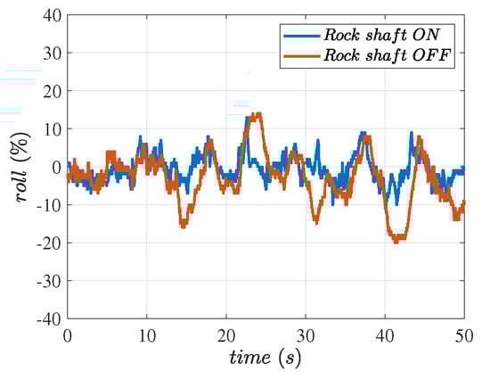 Table 4 summarizes the effect of the software rock shaft algorithm on the roll of an implement. It can be seen that the seed drill’s roll was significantly reduced from the mean of 4.64% to 0.58%. The standard deviation (SD) was reduced from 16.77% to 2.79%. As mentioned above, the roll percent was not significant in the case of the flail mower without the software rock shaft; however, it could still improve the mean roll percent from % to %, and the SD from 6.45% to 3.53%. As shown in Figure 8, the implement roll of 4.64%, 16.77%, %, and 6.45%, observed with software rock shaft off, correspond to up to 1.93°, 6.97°, −1.66°, and 2.69°, respectively.